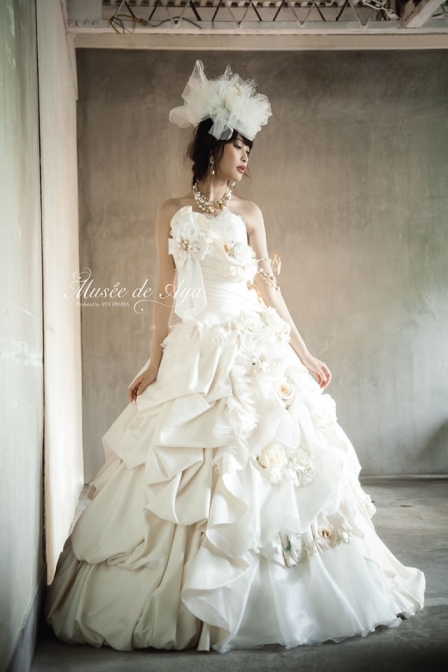 大政絢自身初のプロデュースブランド。 キュートとモード、がらりと表情を変えたふたつの世界で展開。 まるで絵画のように美しく、かつファッショナブルなドレスたちがウェディングシーンに新たな風を送り込みます。